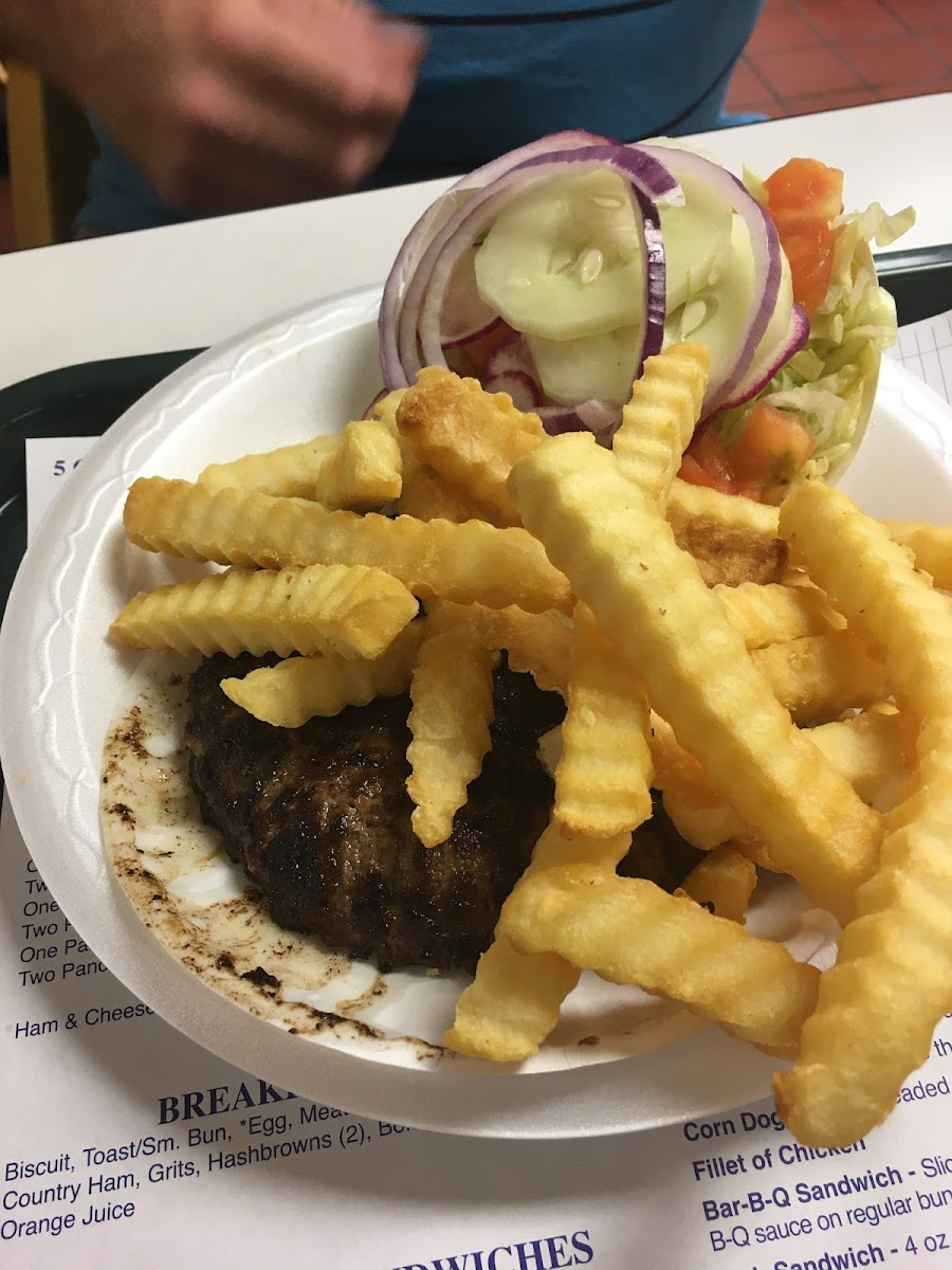 The menu offers a variety of hearty plates centered around burgers and fried sides, with standouts like the What-A-Burger with cheese and bacon, hushpuppies, and the Chuckwagon Plate. Portions tend to be moderate, and while the fries get positive nods for crispiness, they may come in smaller servings than some expect. Breakfast options are available earlier in the day and include simple egg plates paired with coffee, catering well to those seeking a no-fuss start to their morning.